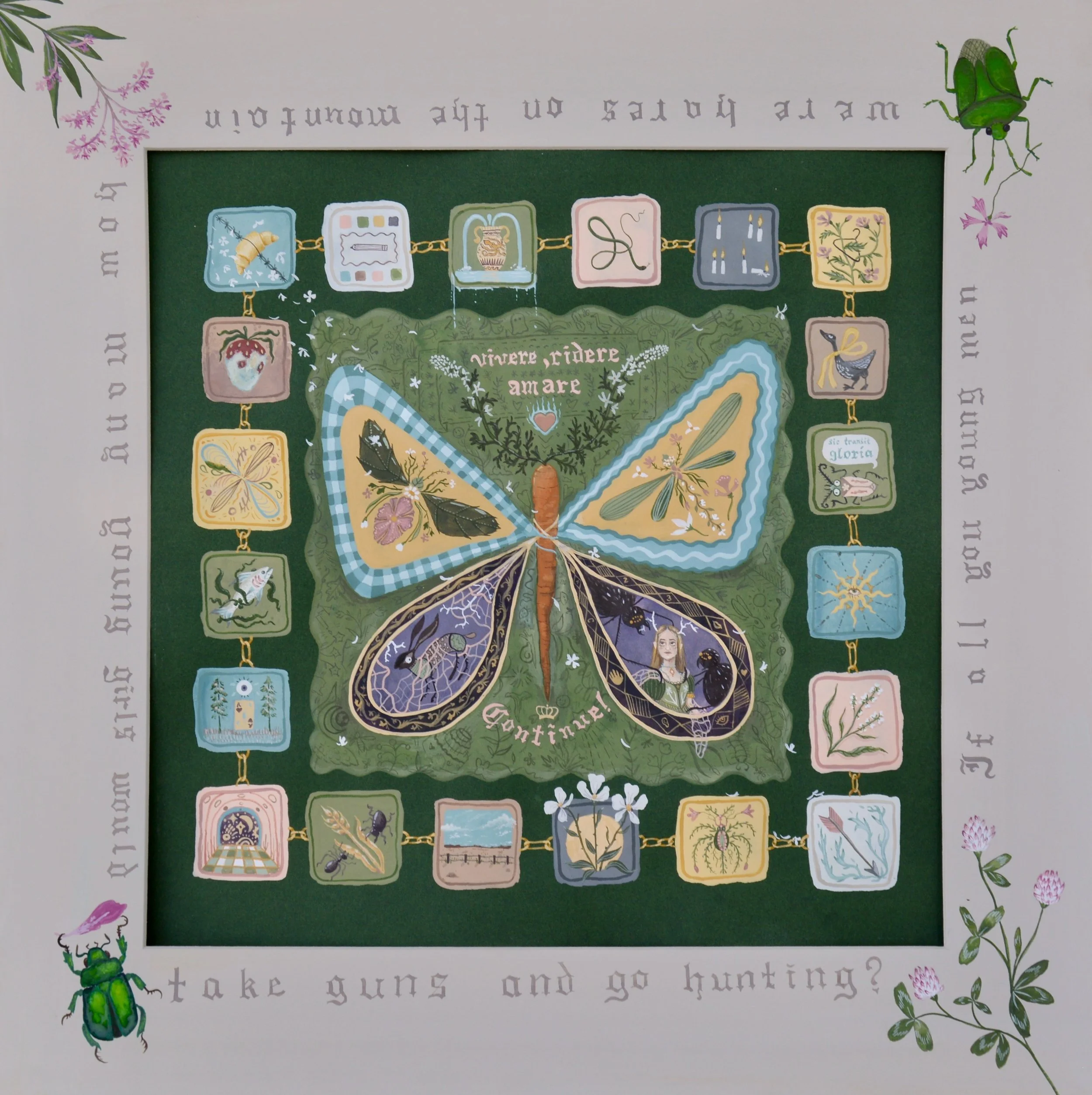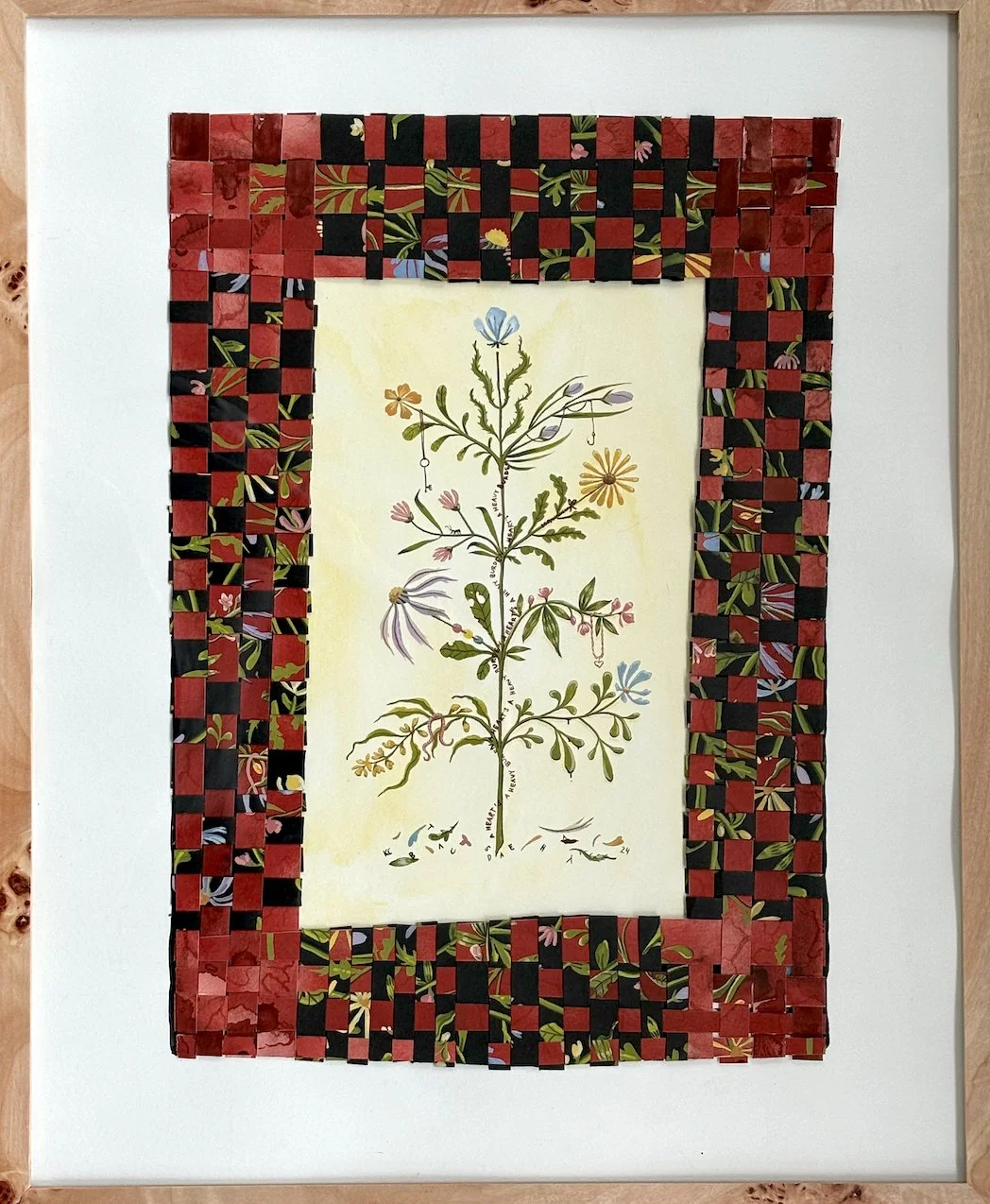 These pieces are inspired by medieval marginalia, early American folk art, and traditionally feminine crafts such as needlepoint, weaving, and papercutting.